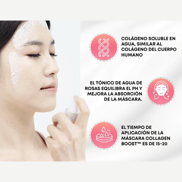 Para obtener mejores resultados, usa un tónico de agua de rosas para equilibrar el pH y mejorar la absorción. Aplica la máscara Collagen Boost™ con colágeno soluble y déjala actuar 15-20 minutos.
