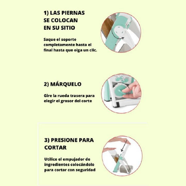 simplemente ajusta el cortador según el tipo de corte que desees, coloca la verdura en su lugar y desliza con suavidad. ¡Preparar tus alimentos nunca ha sido tan fácil!